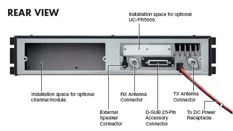 標配D-SUB25 接口支持連接中繼臺控制器或其它外接設備。具有依據接收模擬或數字信號分別在不同ACC不同針腳上分別輸出相應控制信號控制目標設備。