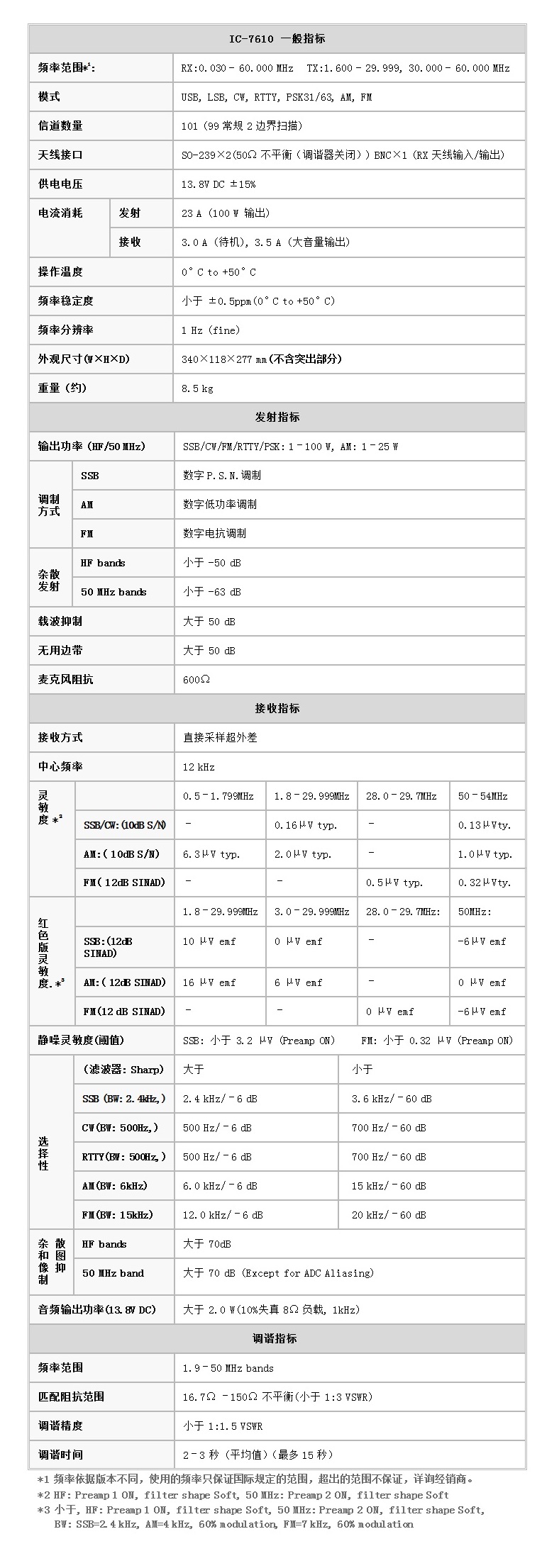 IC-7610多功能短波電臺主要技術參數