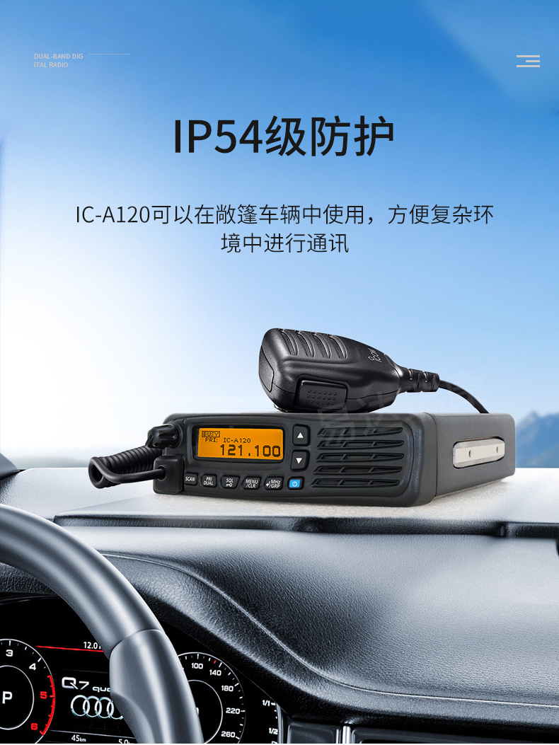 3  IP54  IC-A120此等級防護的航空電臺可以使用在敞篷車輛中。